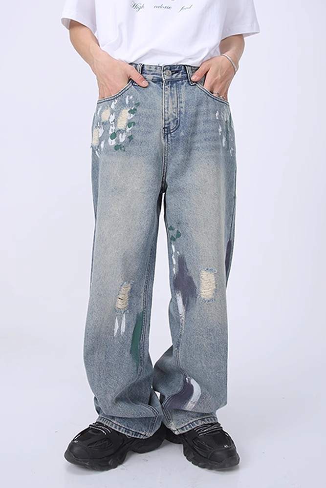 Voguo Relay slimming jeans Korean version with perforated design, loose straight leg, floor length, wide leg, unisex
