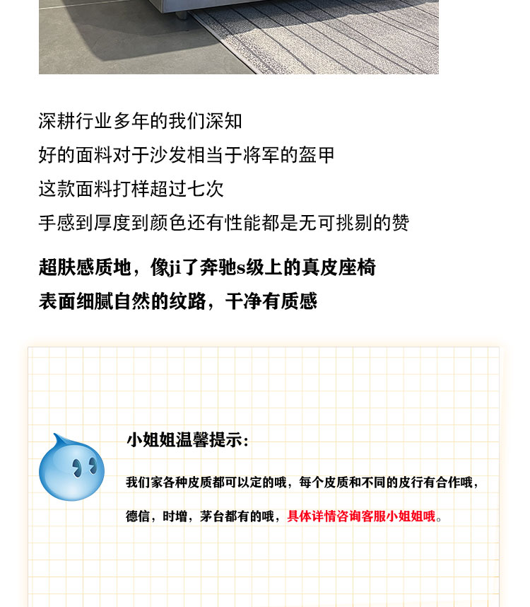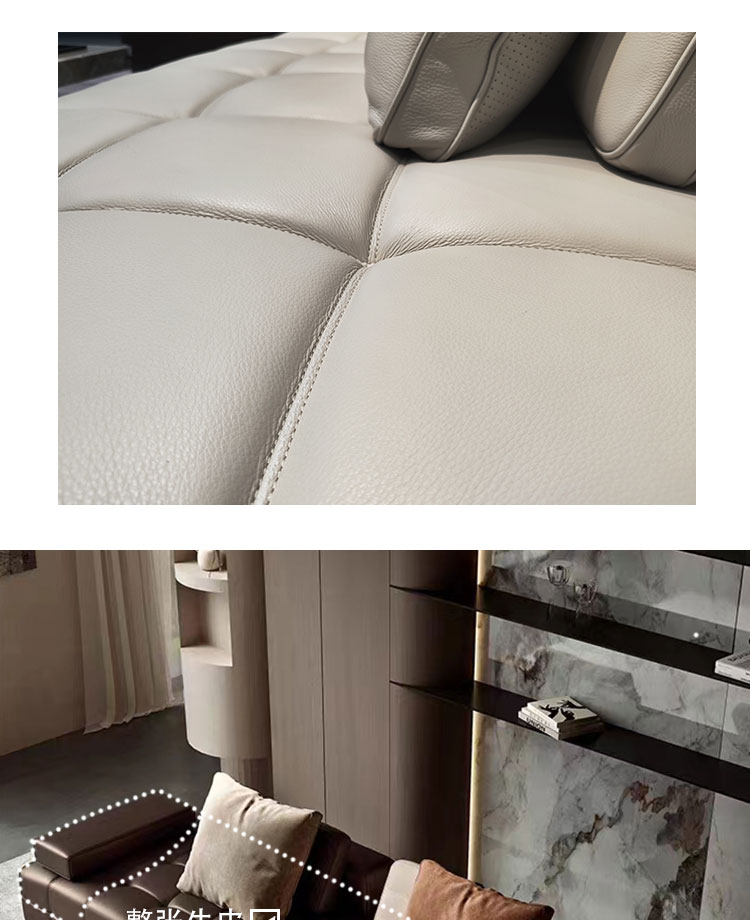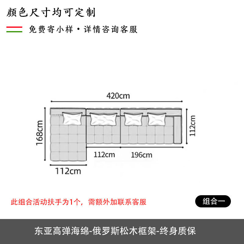 Combination one full leather 4-meter with Guifei, combination two full leather 0.64-meter straight row, combination three full leather 9.9-meter with Guifei, main picture combination with two armrests. 6-meter full leather, combination five full leather. 8-meter straight row with two armrests, combination six full leather. 64-meter with Guifei, full leather. 8-meter straight row with two armrests, three person seat 4CM straight row full leather