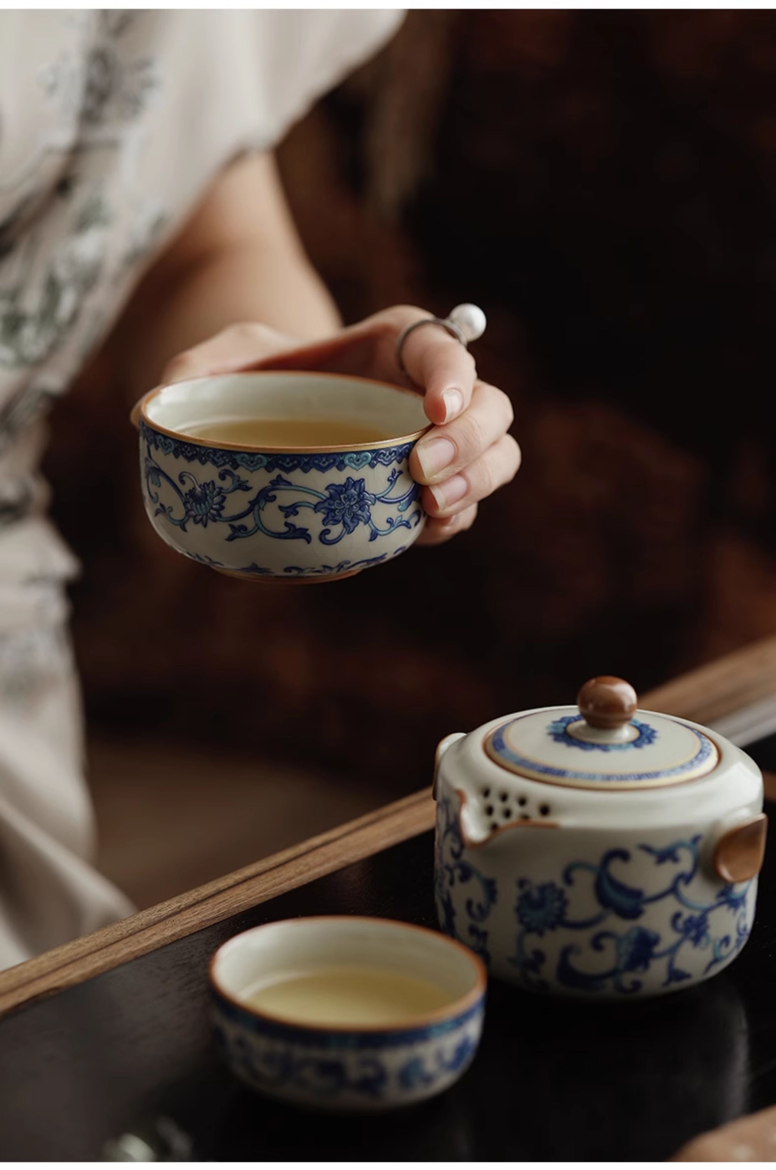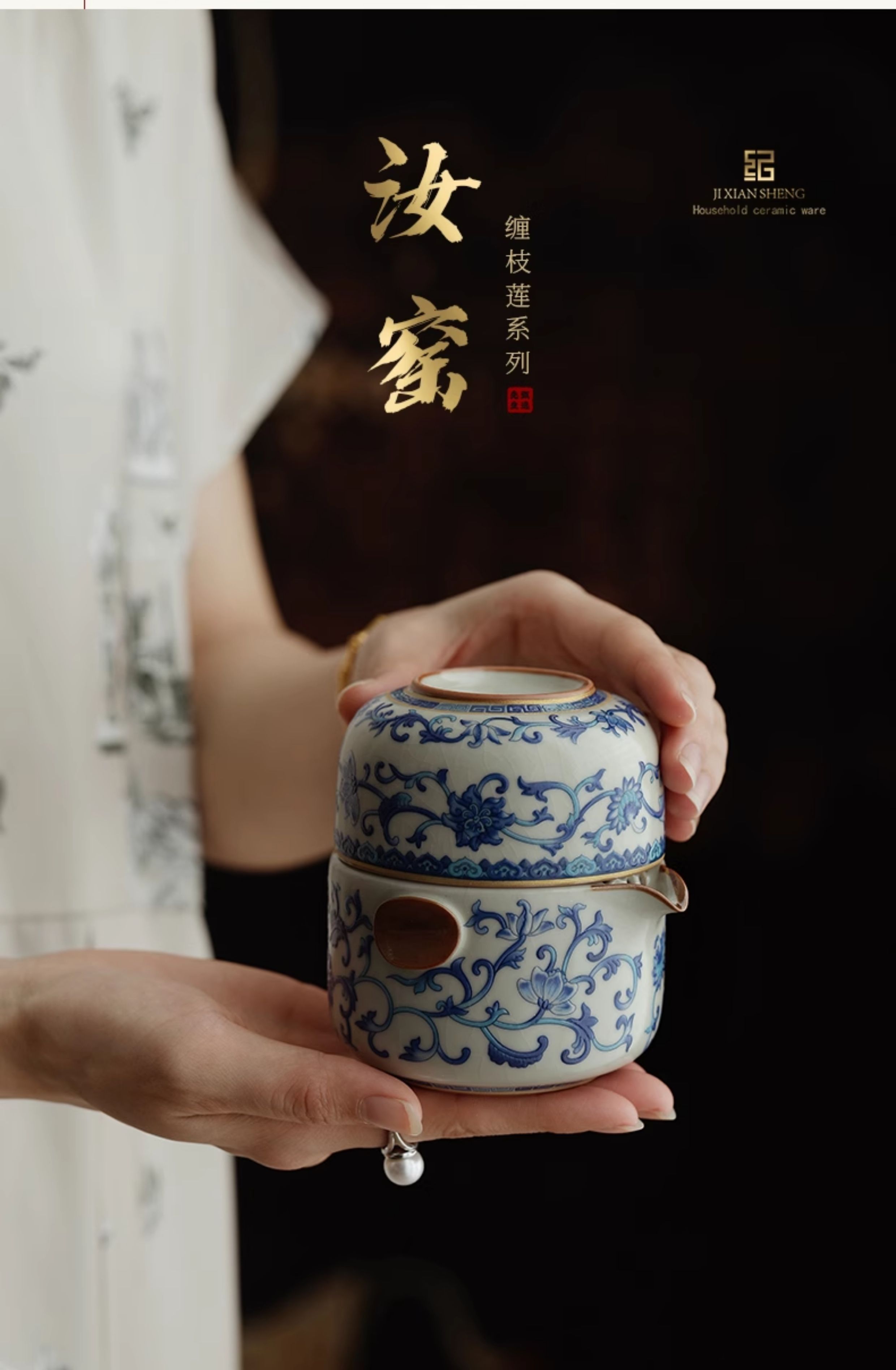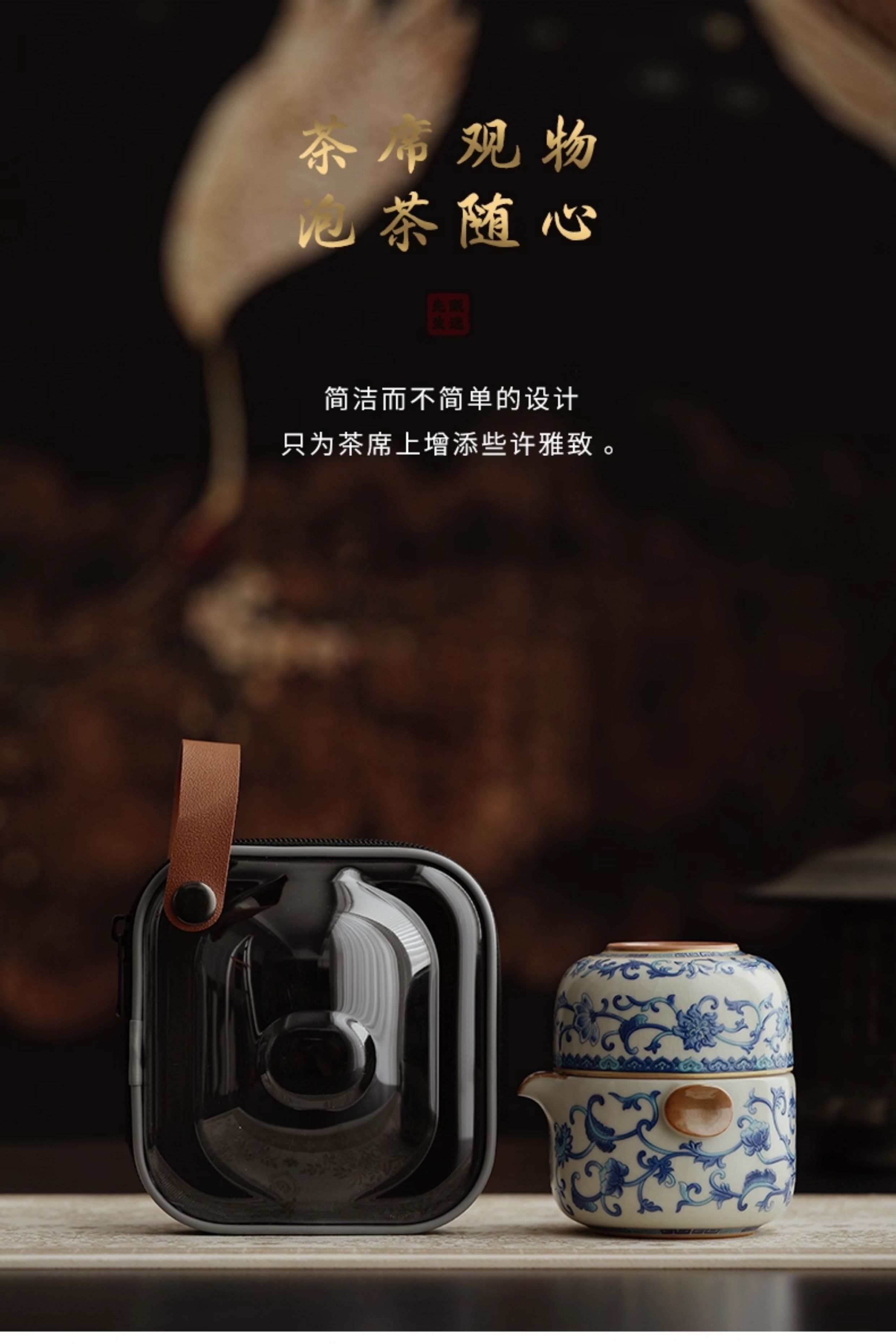 Ru kiln blue and white entwined lotus travel tea set, portable Kuaike cup, one pot, two cups, outdoor tea pot, tea cup set