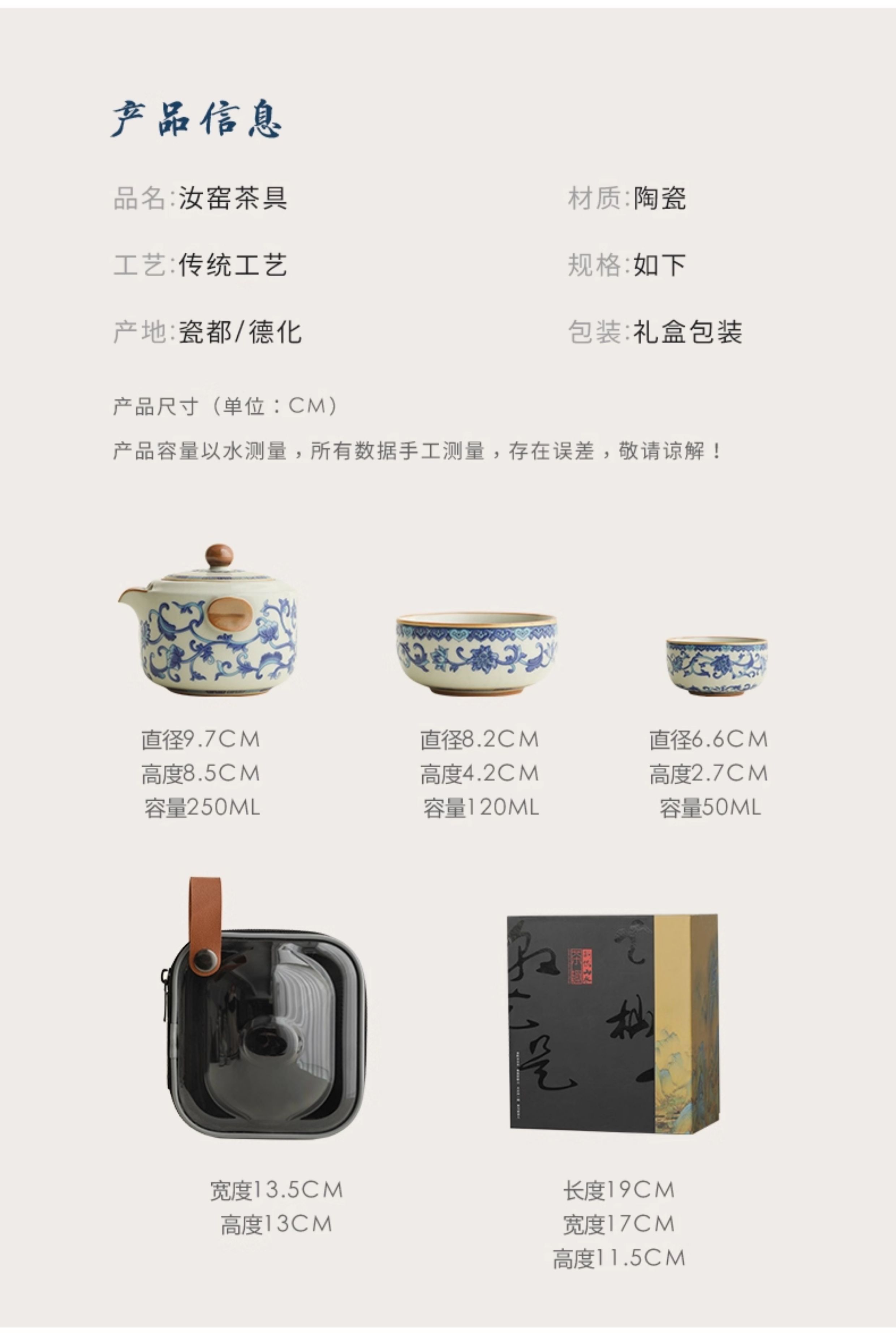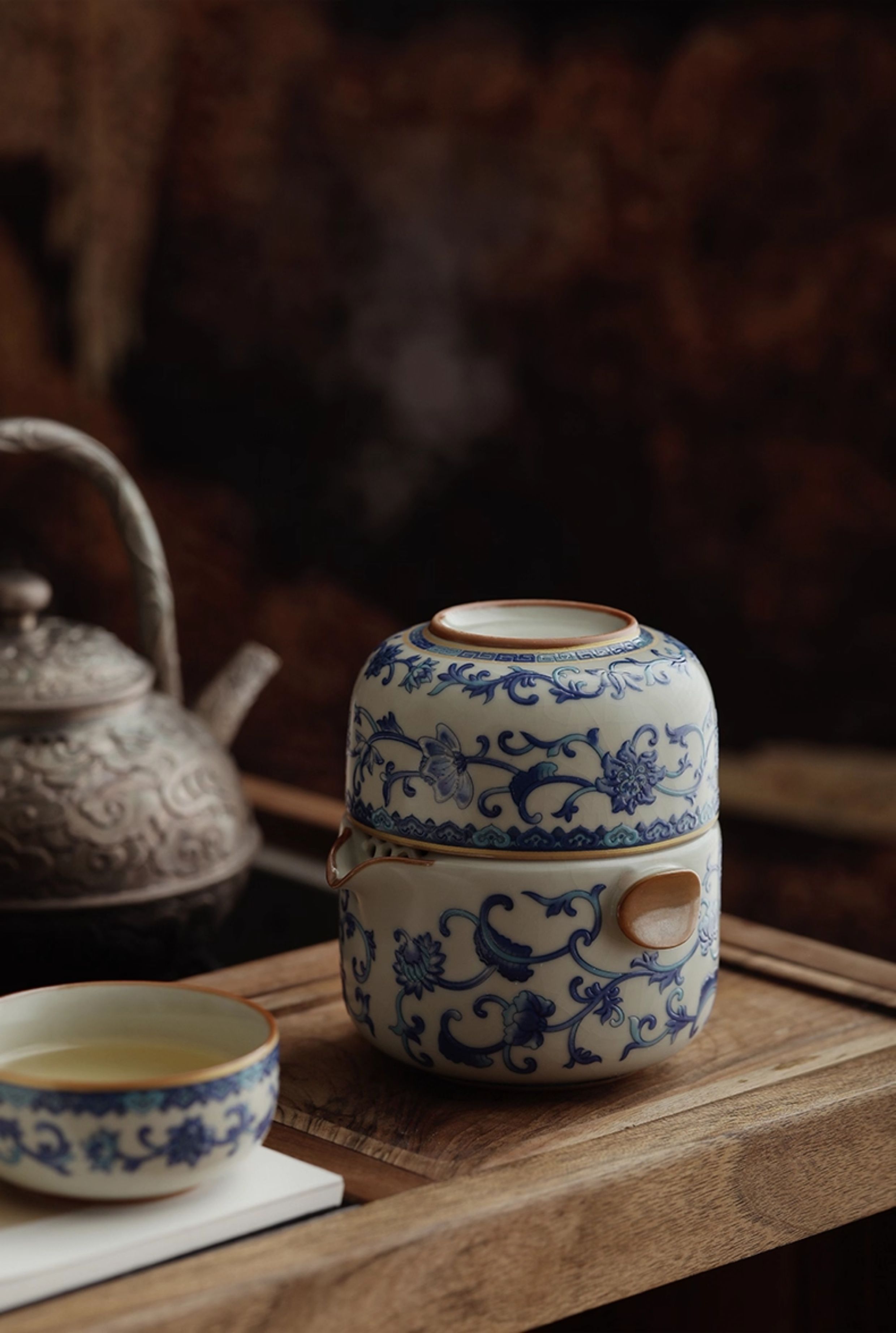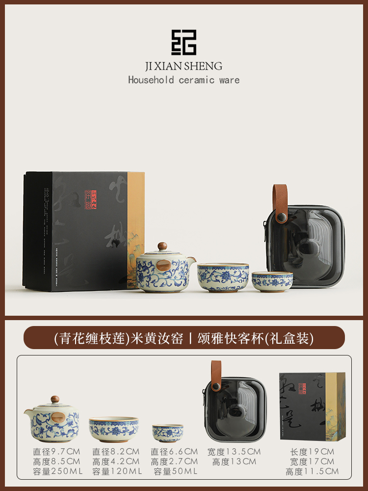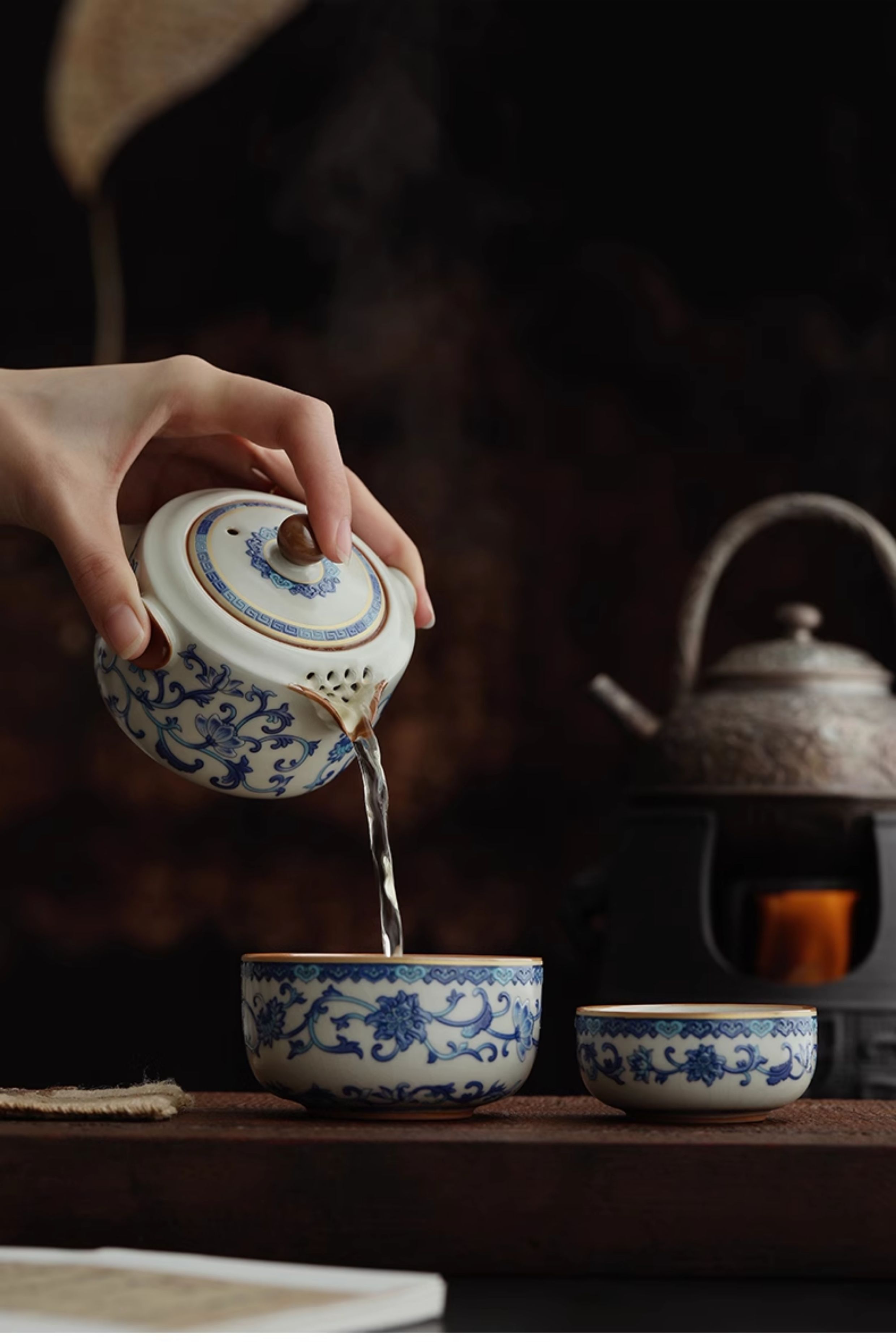 Ru kiln blue and white entwined lotus travel tea set, portable Kuaike cup, one pot, two cups, outdoor tea pot, tea cup set