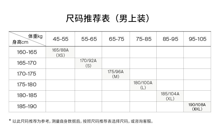 165/88A/XS 170/92A/S 175/96A/M 180/100A/L 185/104A/XL 190/108A/XXL