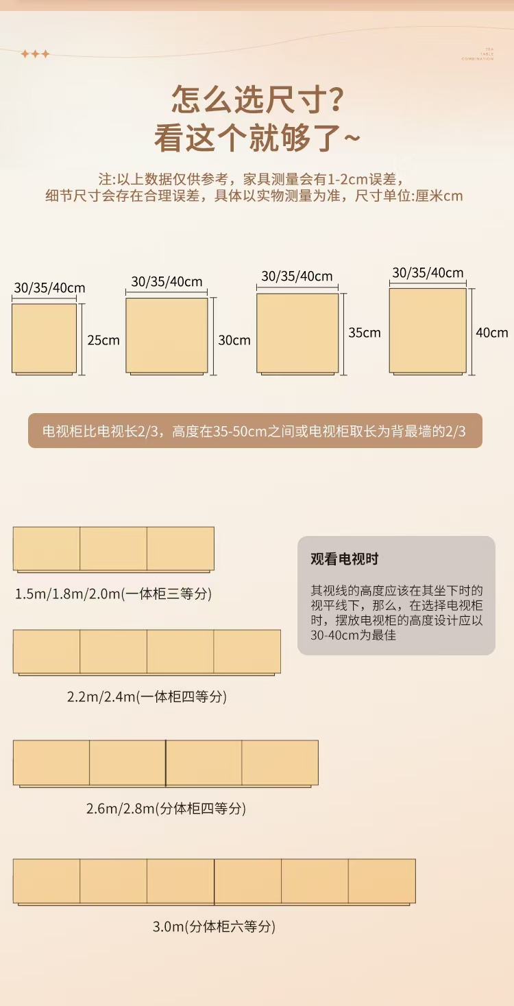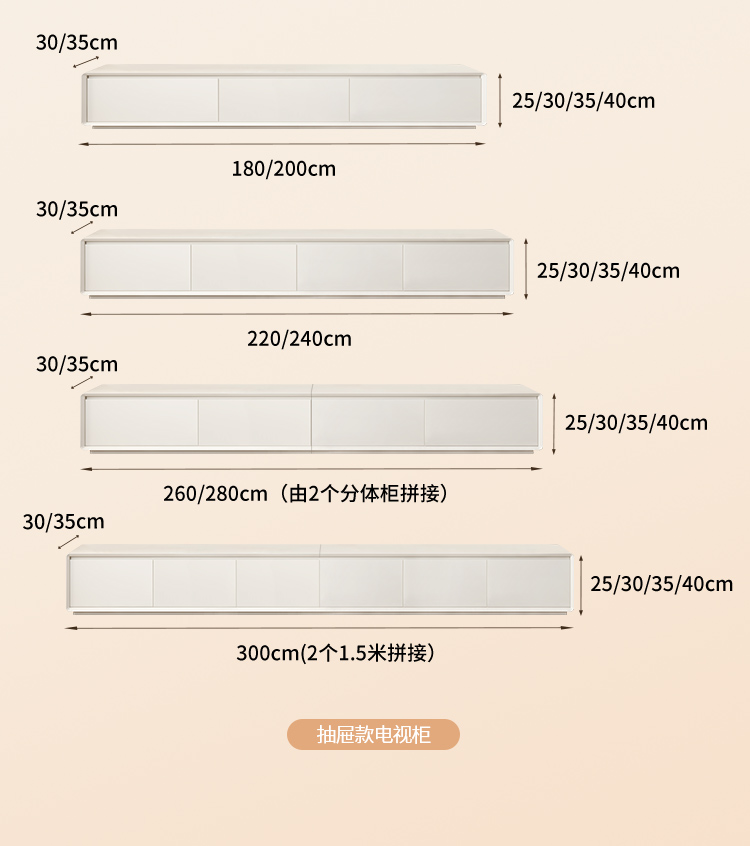 1.6 meters long with one door and two drawers, 1.8 meters long with one door and two drawers, 2 meters long with one door and two drawers, 2.2 meters long with two doors and two drawers, 2.4 meters long with two doors and two drawers, 2.6 meters long with two doors and two drawers (divided into two sections), 2.8 meters long with two doors and two drawers (divided into two sections), 3 meters long with two doors and four drawers (divided into two sections), 1.6 meters long with three drawers, 1.8 meters long with three drawers, 2 meters long with three drawers, 2.2 meters long with four drawers, 2.4 meters long with four drawers, 2.6 meters long with four drawers (divided into two sections), 2.8 meters long with four drawers (divided into two sections), and 3 meters long with six drawers (divided into two sections)