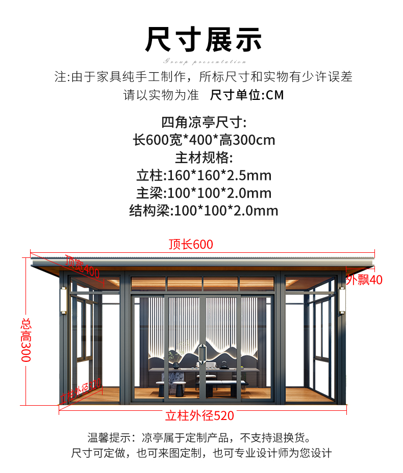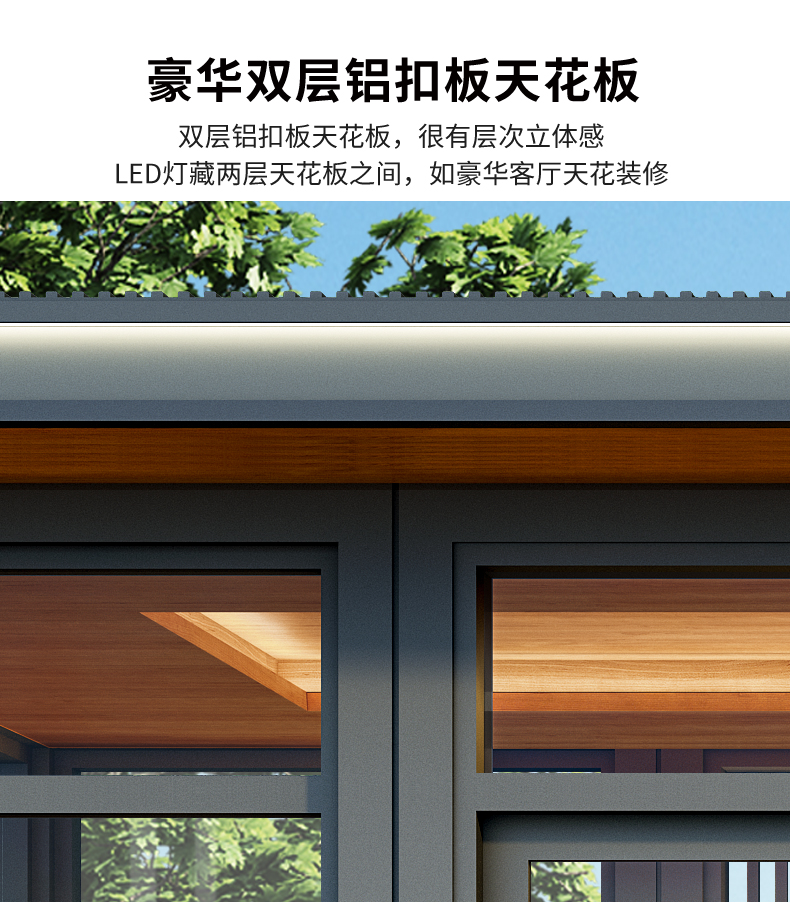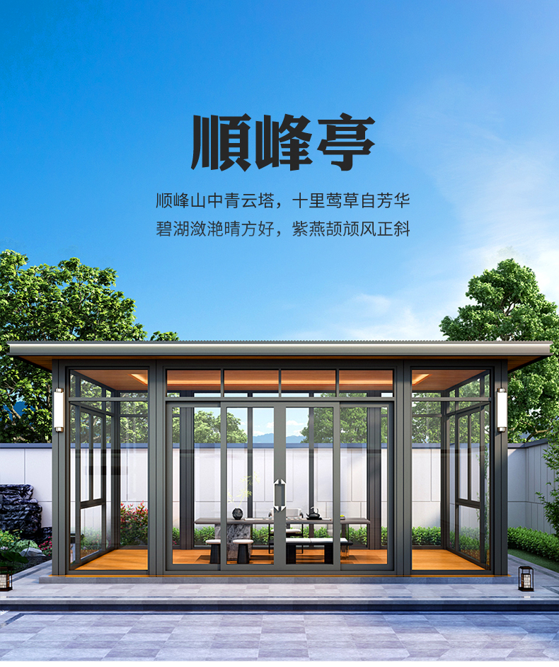 Shunfeng Pavilion 4.2 * 4.2m front sliding door, left and right windows, back fixed glass (without suspended ceiling) Shunfeng Pavilion 4.2 * 4.2m front sliding door, left and right windows, back fixed glass (including suspended ceiling) Shunfeng Pavilion 6 * 4m front sliding door, left and right windows with gauze, back screen rockery (including suspended ceiling) sand gray Shunfeng Pavilion 4.2 * 4.2m front sliding door, left and right windows, back rockery screen (without suspended ceiling) -Sand gray Shunfeng Pavilion 4.2 * 4.2m front sliding door, left and right windows, back rockery screen and suspended ceiling - Sand gray Qingya Ting-4.2 * 4.2m front sliding door, left and right windows, back fixed glass strip insulation board, no suspended ceiling Qingya Ting-4.2 * 4.2m front sliding door, left and right windows, back fixed glass strip suspension ceiling and insulation board Qingya Ting-6 * 4m front sliding door, left and right windows, back fixed glass strip insulation board, no suspended ceiling Qingya Ting-6 * 4m front sliding door, left and right windows, back fixed glass strip suspension ceiling and insulation board Xiu Xin Ge -4.2 * 4.2m front sliding door, left and right windows, back fixed glass strip suspension ceiling, false mountain strip suspension ceiling Xiu Xin Ge -6 * 4m front sliding door, left and right windows, back screen rockery with suspended ceiling Shunfeng Ting-6 * 4m two-story light strip, front sliding door, left and right windows, back fully insulated panel with suspended ceiling. Shunfeng Ting-6 * 4m with sink, front sliding door The back of the left and right windows of the flat opening window is sealed with a window (without a suspended ceiling). The Shunfeng Pavilion is 6 * 4 meters with a sink and a suspended ceiling. The front sliding door and the back of the left and right windows of the flat opening window are sealed with a window. The Shunfeng Pavilion is 6 * 4 meters with a front sliding door and left and right windows with a back screen and a rockery and suspended ceiling. The bathroom is 2.4 * 1.9 meters long and other sizes are customized with a deposit of 2